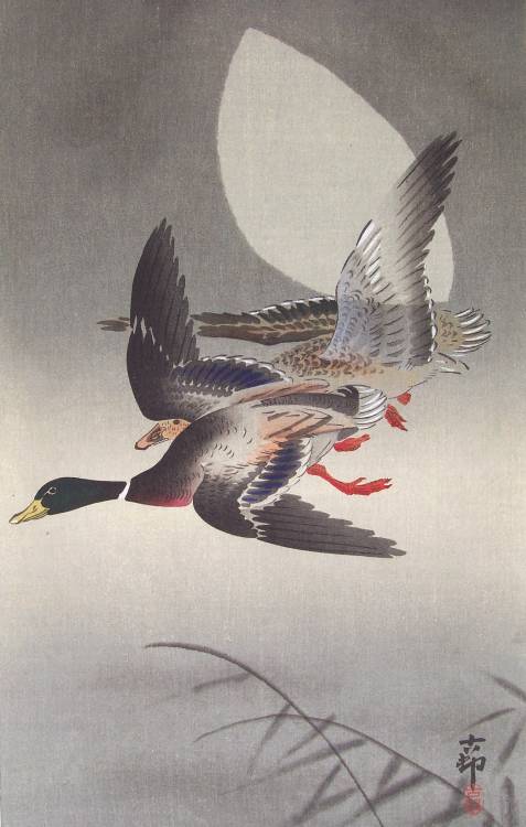 A gorgeous Koson image of two ducks flying before a partial moon. PRE-1923 earthquake (note: Daikoku-ya Publisher ceased