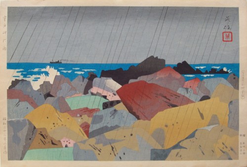 Fine. Nicely executed "bokashi" shading; light "gauffrage" to rocks; nice over-printed streaks of falling rain. |