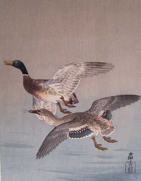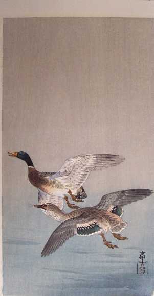 Two colorful mallards on the wing above water. Believed PRE-1923 earthquake (note: Daikoku-ya Publisher ceased