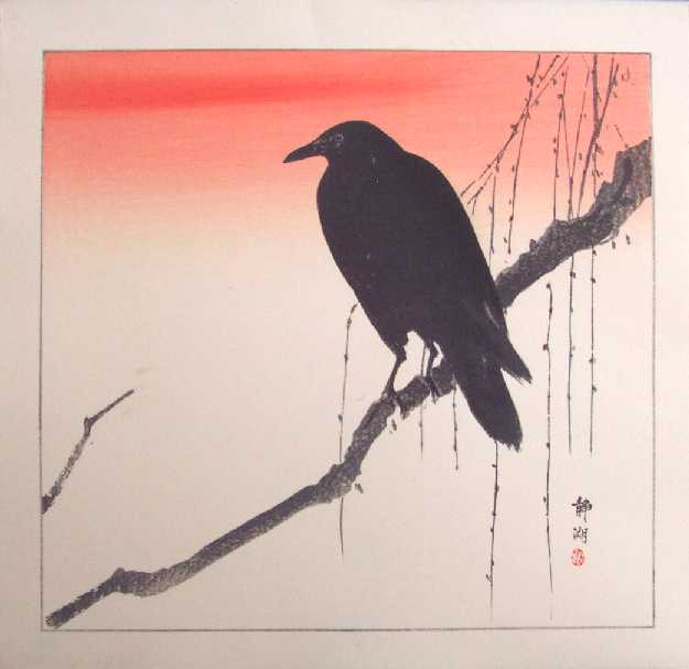 A bold and colorful image of a crow silhouetted against an orange evening sky. PRE-1923 earthquake