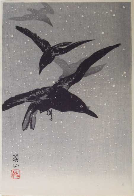 A striking wintertime image of four crows flying in a snowstorm. Not often seen. Sozan designed prints for Watanabe from 1919 until 1926,