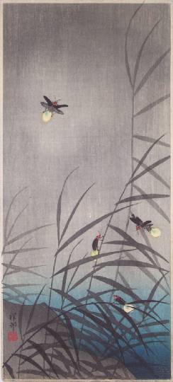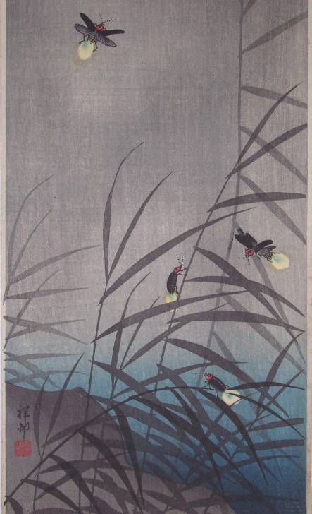 A delightful image of four colorful fireflies seen fluttering in the dark above reeds along a riverbank. Seldom seen. |