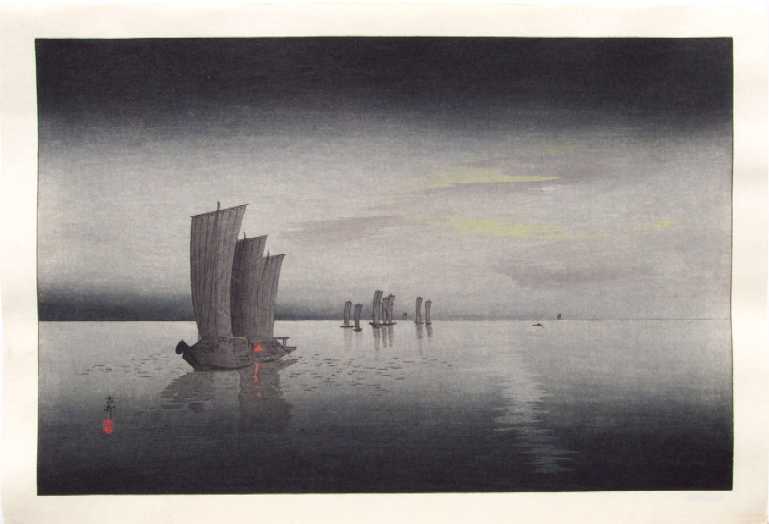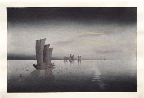 Fishing boats returning to shore at dusk. An interestingly larger variant to the "CCC" K44.26 print (which