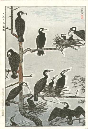 Delightful image of perched and nesting cormorants. Sold out--hard to find. |