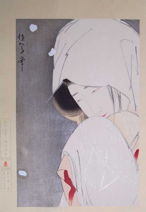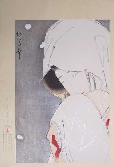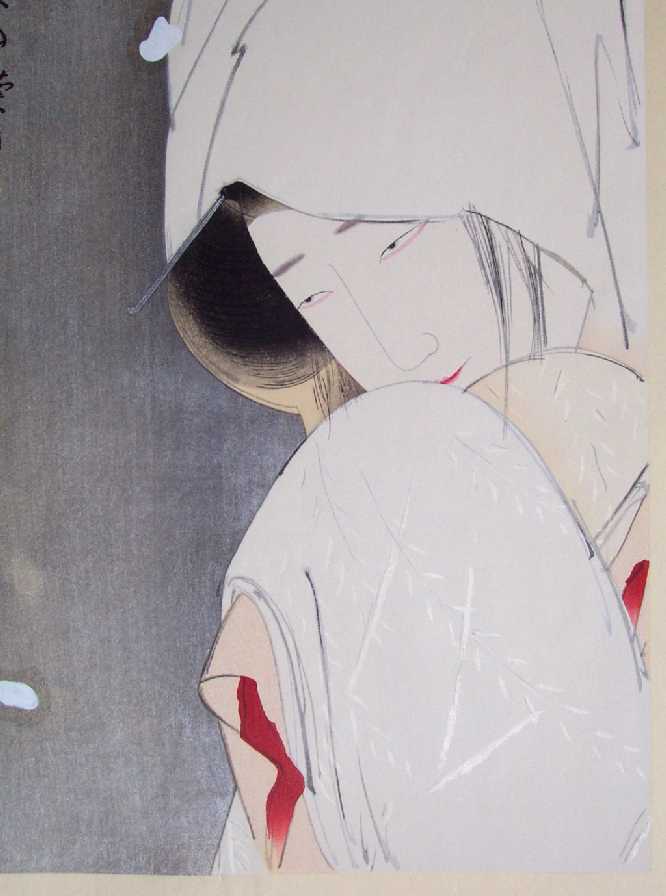 nicely over-printed hairlines; silver "metallic" highlights to hair-pin and lower kimono; highly detailed carving. |