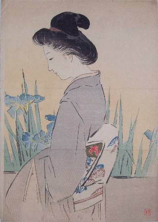 Very Fine. Nicely executed "bokashi" shading to kimono, irises, and background; nicely detailed lines. |