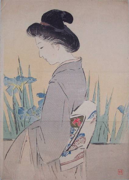 A pensive bijin-ga strolling past an iris garden. |