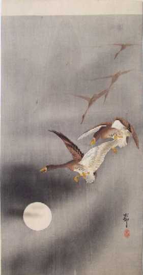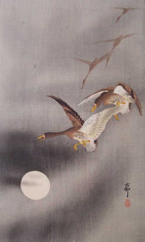 Five white-fronted geese in flight against clouds above a full moon. PRE-1923 earthquake (note: Daikoku-ya Publisher ceased