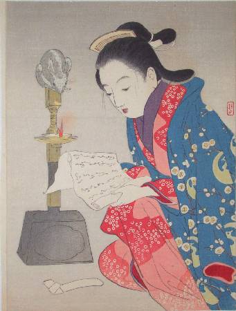 Fine. Skillfully executed "bokashi" shading to kimono, candle holder, flame's glow, mouse and background; crisply detailed individual hair-lines and other details. |