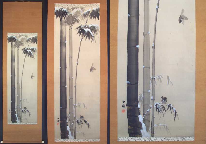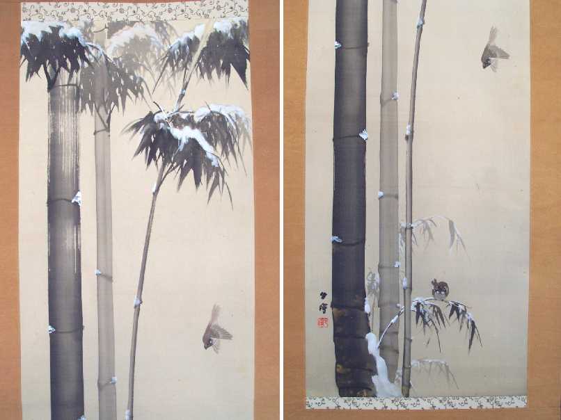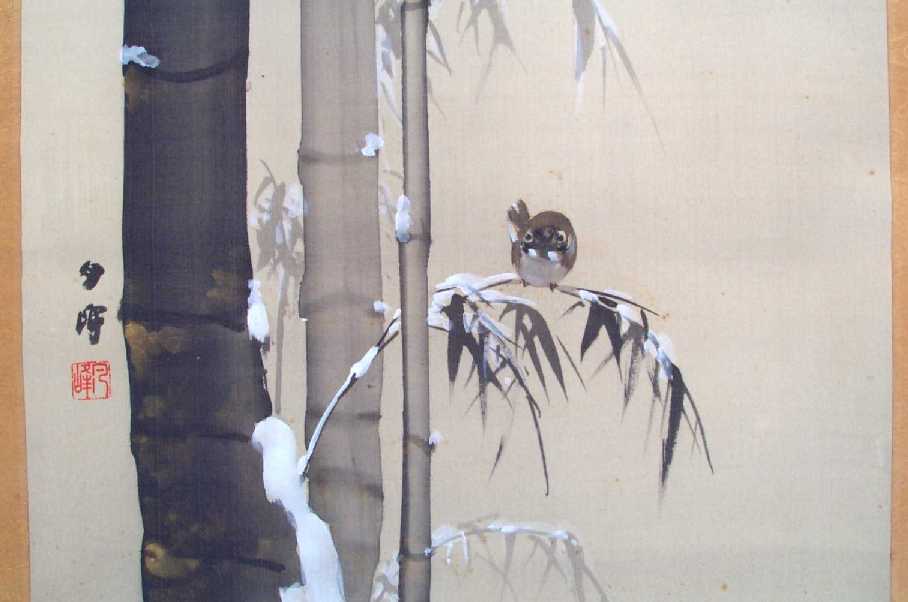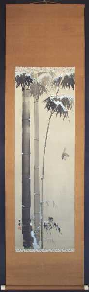 A beautifully hand-painted artwork, with wonderfully rendered snow-covered bamboo foliage--nicely mounted as a hanging