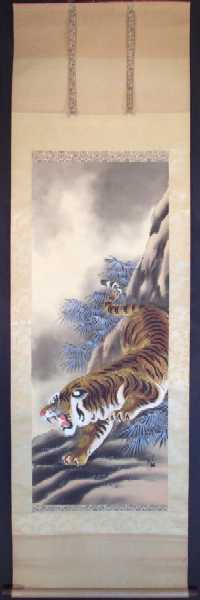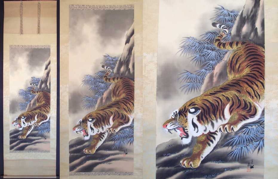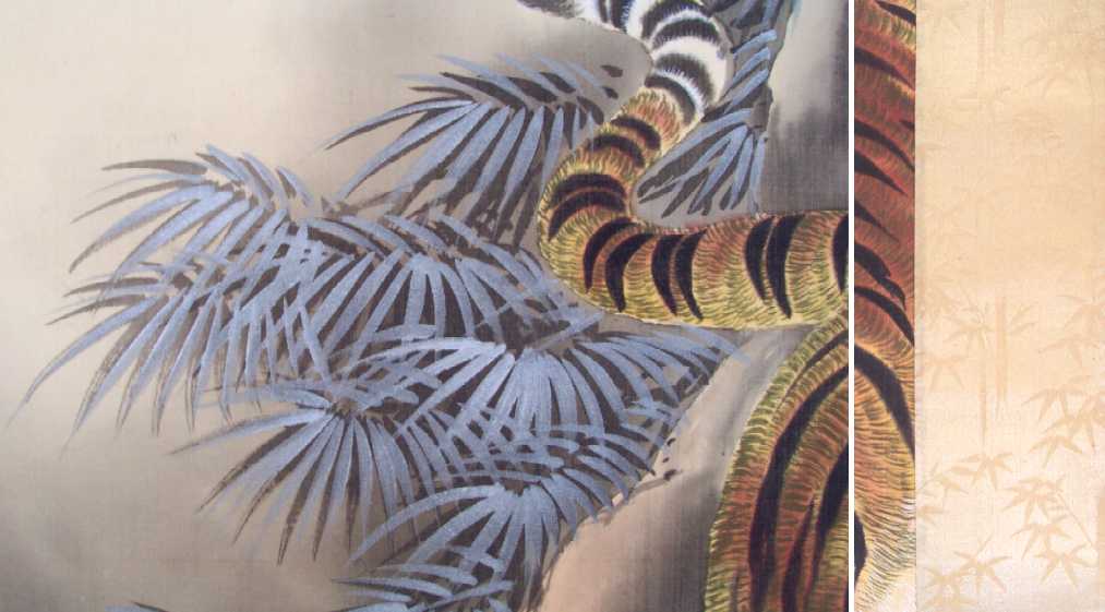 Painting itself is black and grey "sumi" plus colors on light tan silk. |