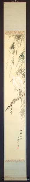 An attractively composed tall/narrow format scroll painting of a little white heron perched beneath a