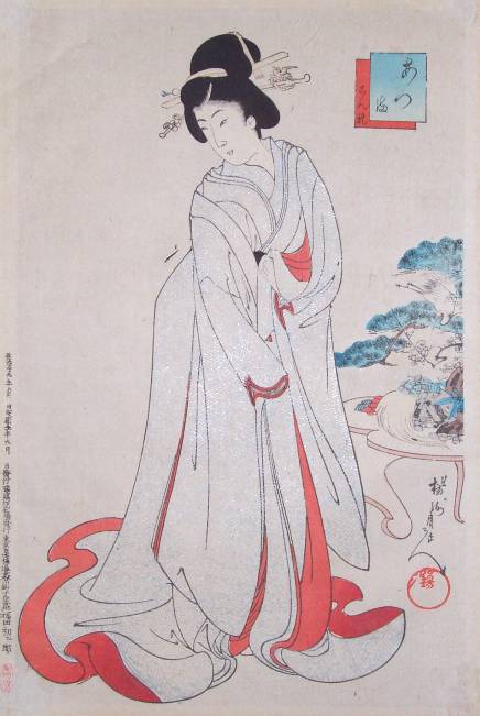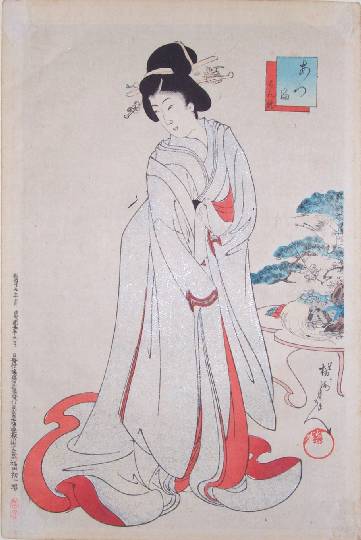 A high-ranking courtesan in fine, silver (metalic-pigmented) kimono. |