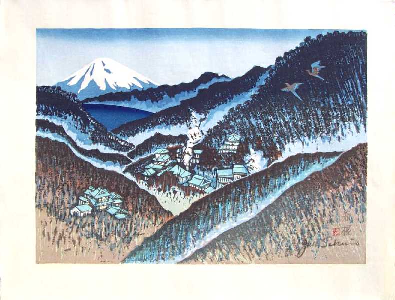 Attractive and colorful mountain scene--in bold, "semi-sosaku hanga" style. |