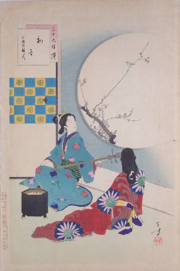 Colorful and skillfully printed "bijin-ga" image, playing a shamisen while viewing out an open, circular window. |