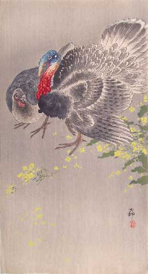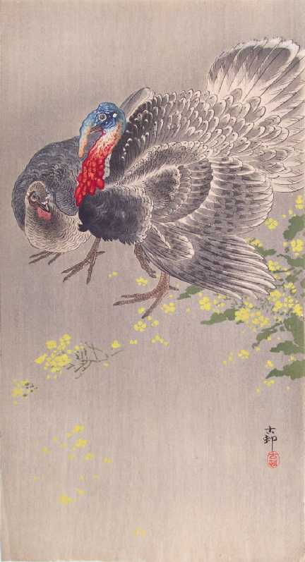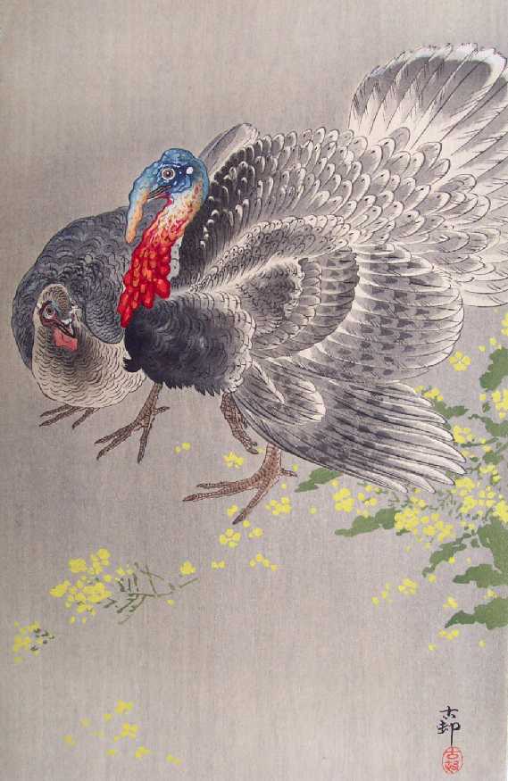 A colorful image of a two turkeys next to a flowering yellow plant. PRE-1923 earthquake (note: Daikoku-ya Publisher ceased