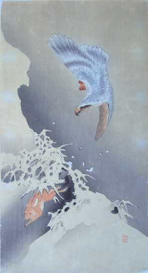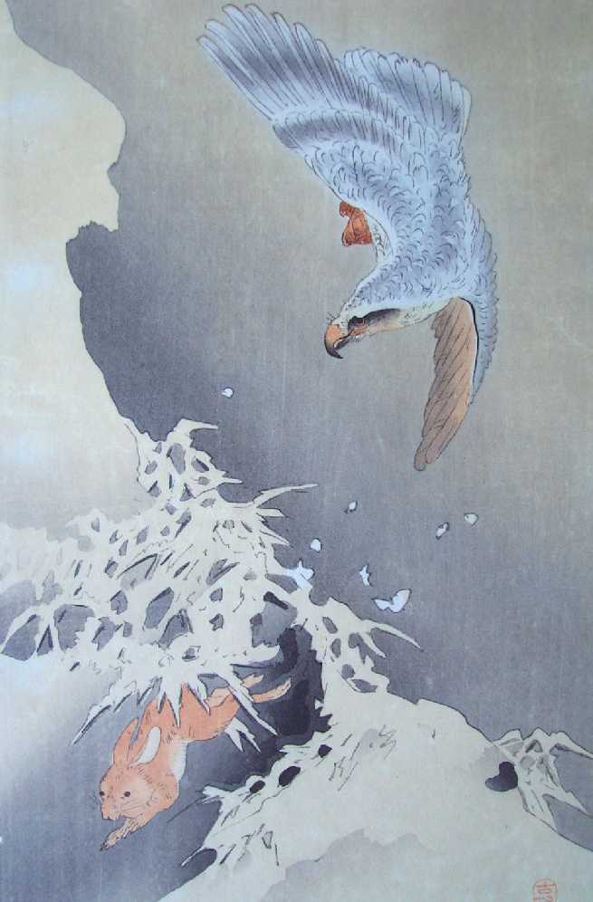 A dramatic scene of a diving hawk in close pursuit of a fleeing hare. Rarely seen.
