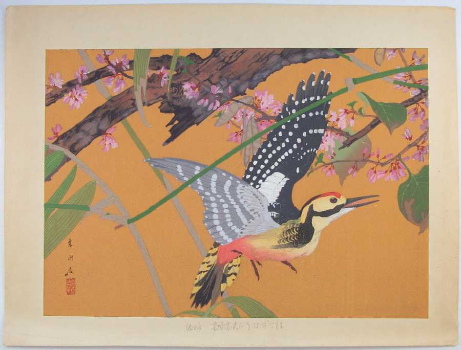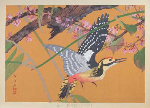 "Redbud and White-backed Woodpecker (Early Spring)" ("hanazuou ni oo akagera (shoshun)") |