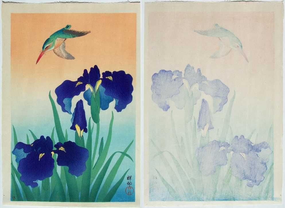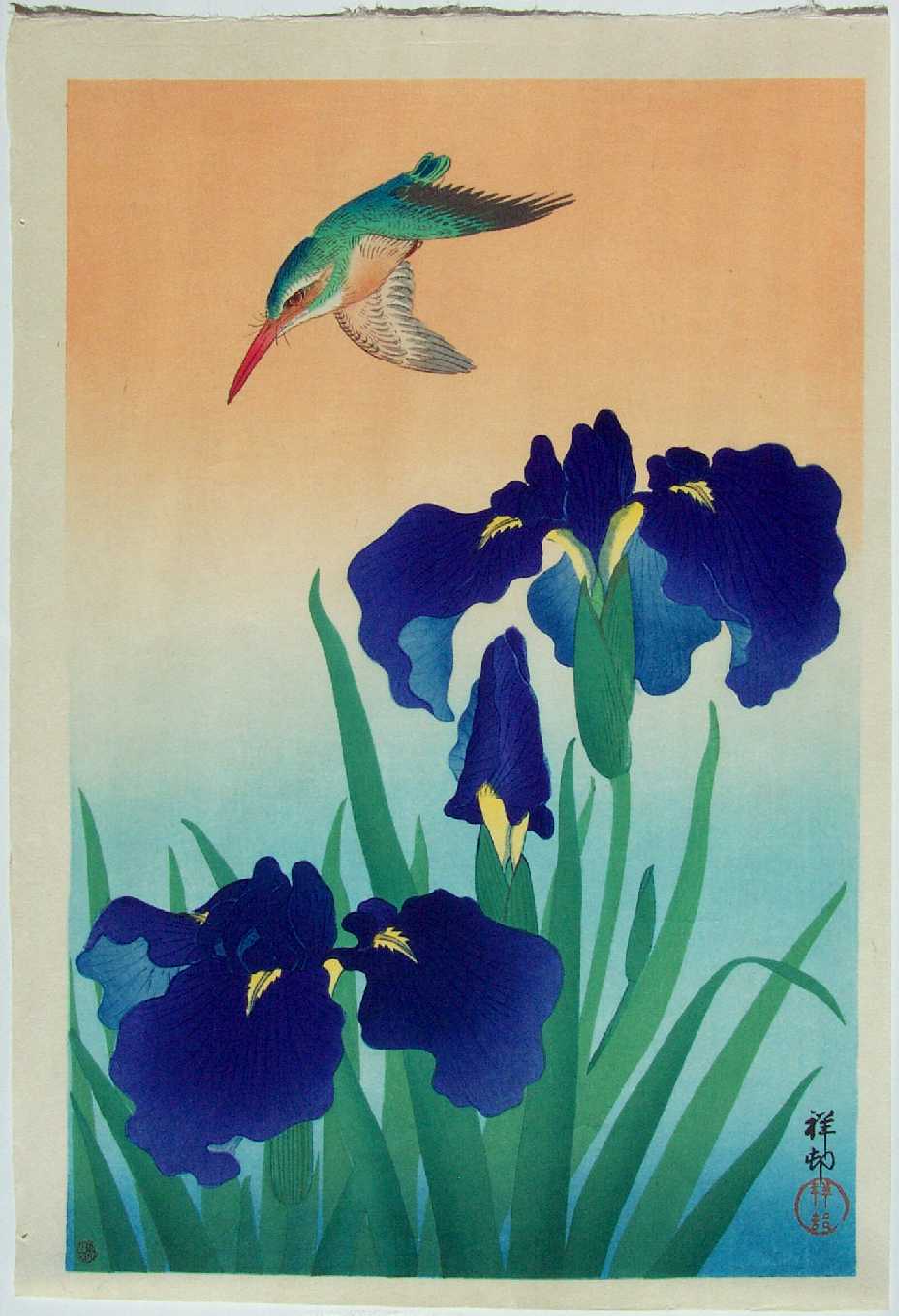 Very Fine. Nicely executed "bokashi" shading to kingfisher, iris flowers and foliage, and two-color background;