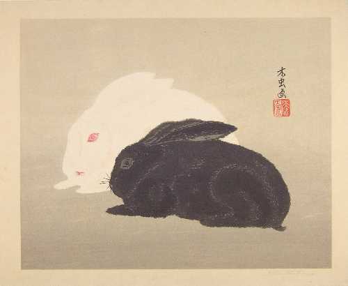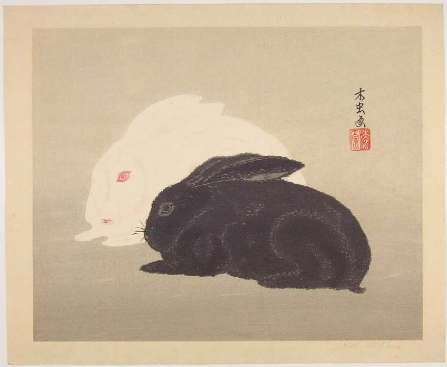 A cute black and white rabbit pair. Urushibara left Japan 1908,