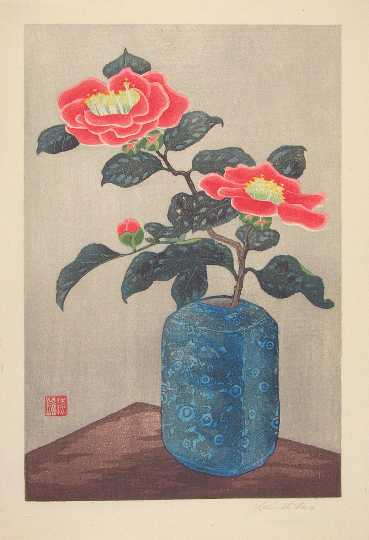 Colorful flower arrangement--printed in soft colors. Urushibara left Japan 1908,