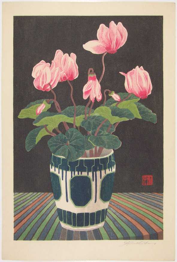 Colorful flower arrangement--printed in soft colors. Urushibara left Japan 1908,