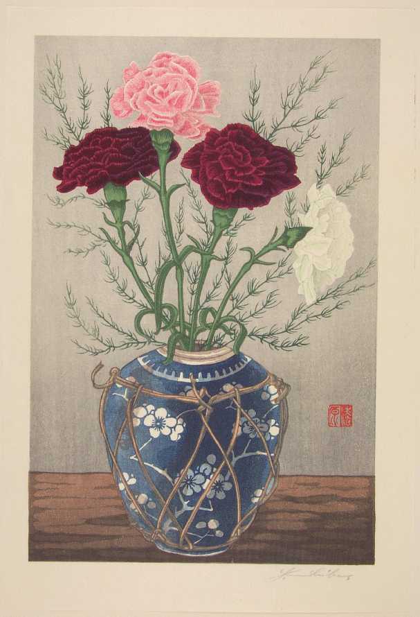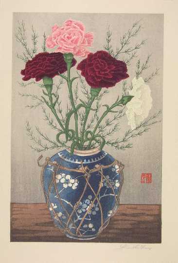 Very Fine. Nicely executed "bokashi" shading; light "gauffrage" (embossing) to flowers and vase;