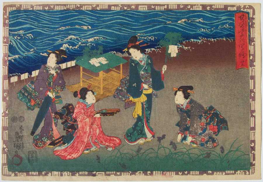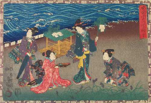 An attractively colorful print from Kunisada's widely popular 1849-53 "The Tale of Genji" series. |