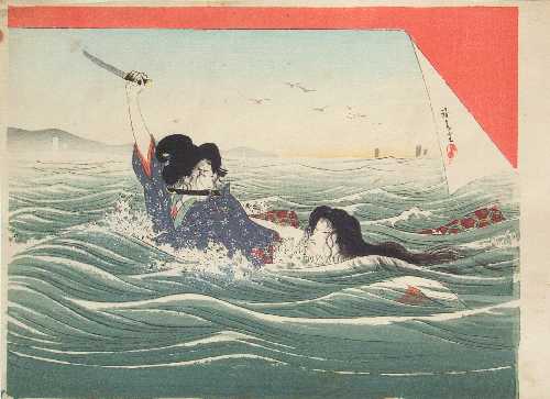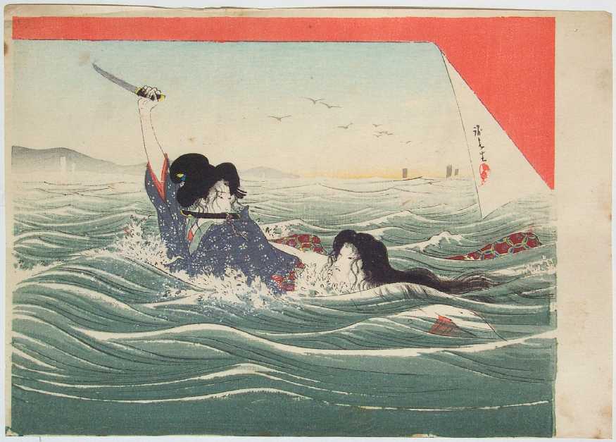 A dramatic image of two women fighting at sea--upper image shown as if rolled-over.