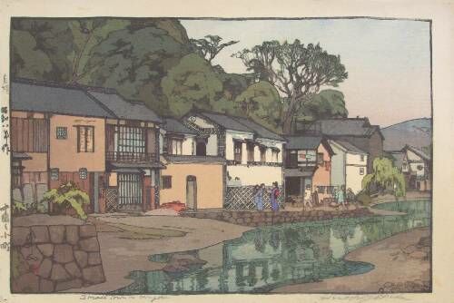 Very Fine. Skillfully executed "bokashi" shading to sky, mountains, water, and foreground; light "gauffrage" to buildings; life-like reflection; crisply detailed lines. |