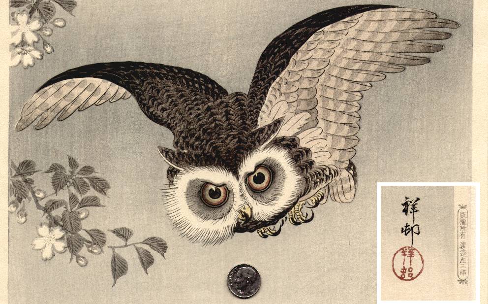 Striking image of a scops owl in flight under a full moon. Watanabe "C-seal," used only 1929-42. |