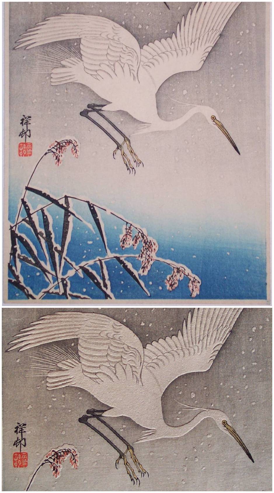 Very fine; superbly executed "bokashi" shading; lightly "gauffraged" feathers; crisp lines. |