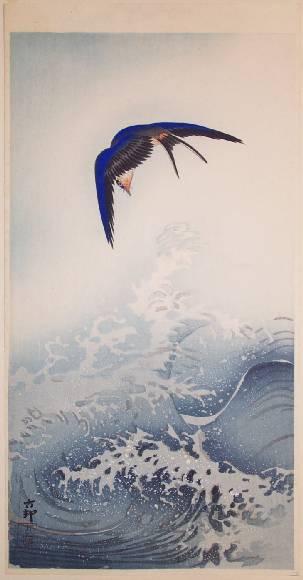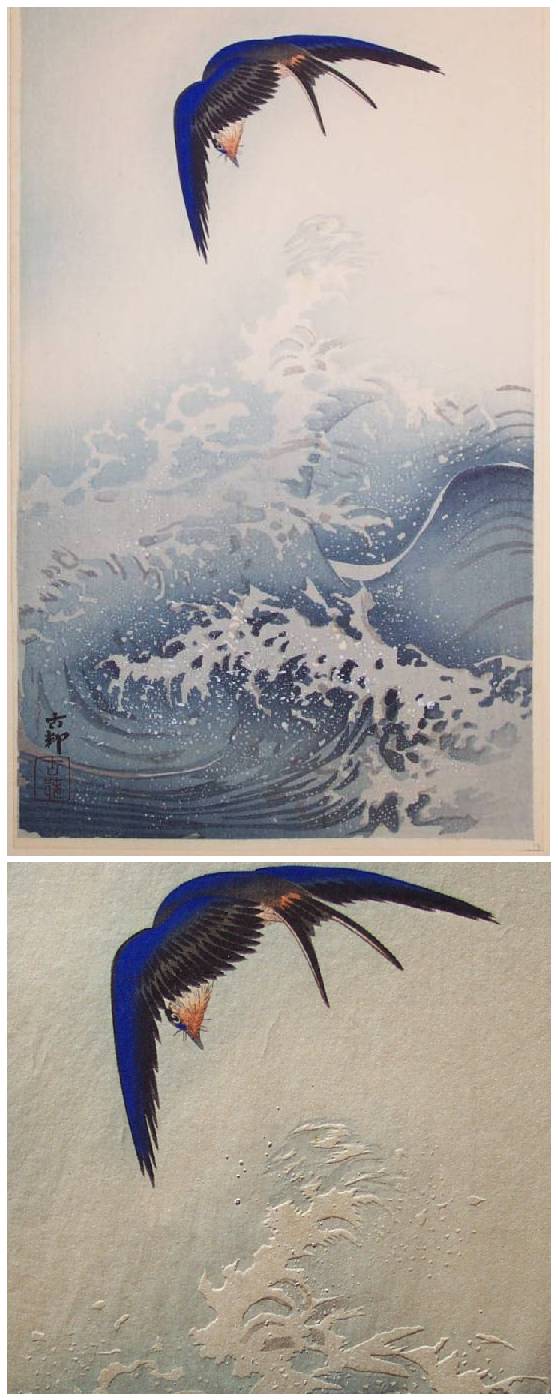 Very fine; superbly executed "bokashi" shading; "gauffraged" wave-tips; over-splashed white "gofun" to waves; crisp lines. |
