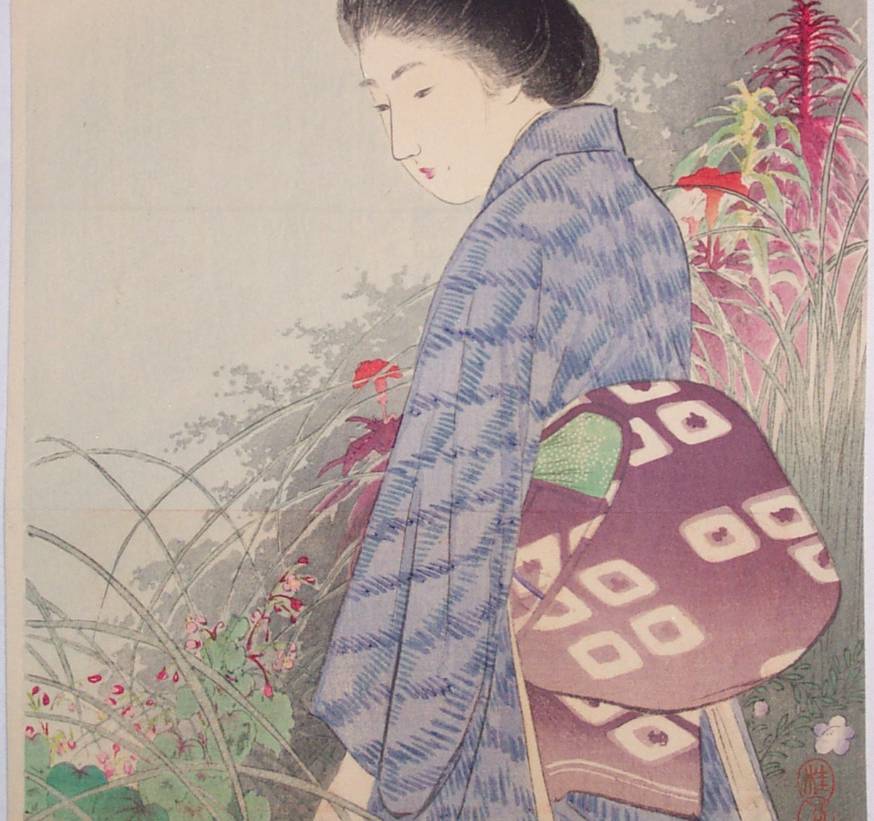 Very Fine. Skillfully executed "bokashi" shading; "gauffrage" to green area of "obi," crisply detailed lines. |