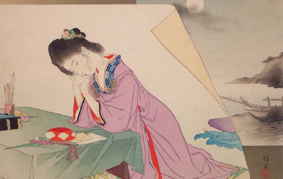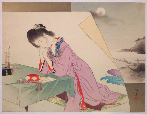Very Fine. superbly executed "bokashi" shading; "burnishing" to hair; extensive leaf-pattern "gauffrage" to entire purple kimono and letter; crisply detailed lines. |