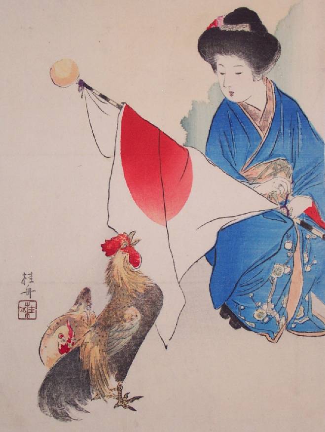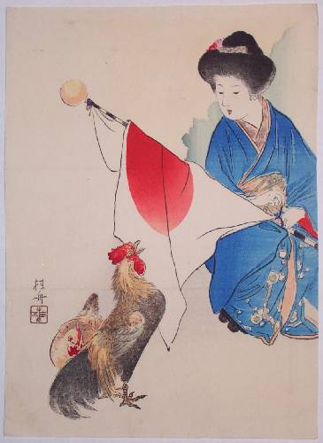 Published in 1909, the "year of the cock," a young woman kneels with a unfurled Japanese flag before an attentive, red-topped cock. |