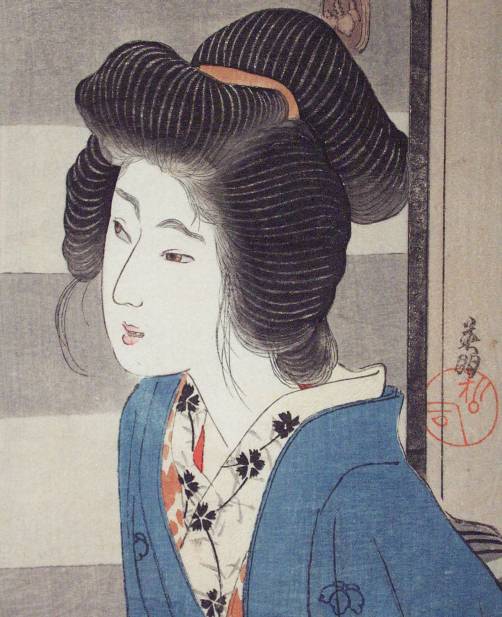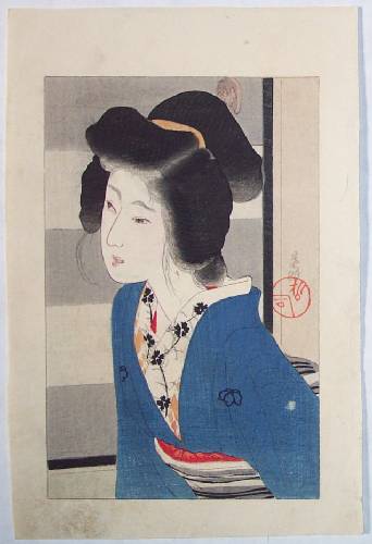 Very Fine. Nicely executed "bokashi" shading, including pink to face; "gauffrage" to collar and eyes; superbly done "burnishing" to produce "layered" hair; crisply detailed lines. |