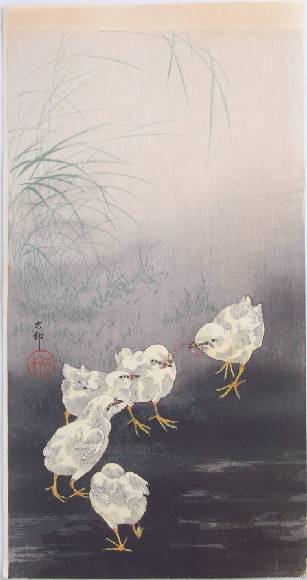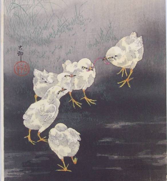 A delightful image, five little chicks fighting over a tasty treat. PRE-1923 earthquake (note: Daikoku-ya