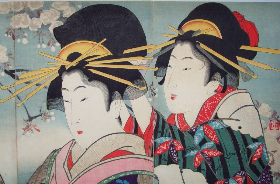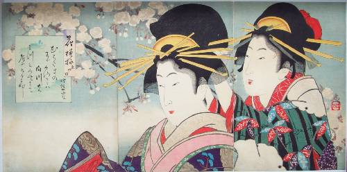 Very Fine. Skillfully done "bokashi" shading to kimonos and background; over-printed hair via "burnishing"; lightly "gauffraged" (embossed) cherry blossoms, kimonos, and title cartouche; and amazingly detailed carving of individual hairlines. |