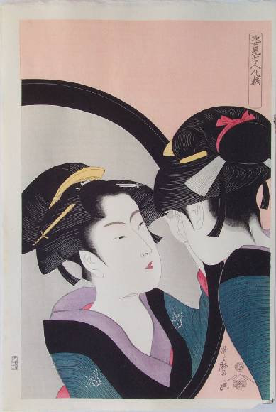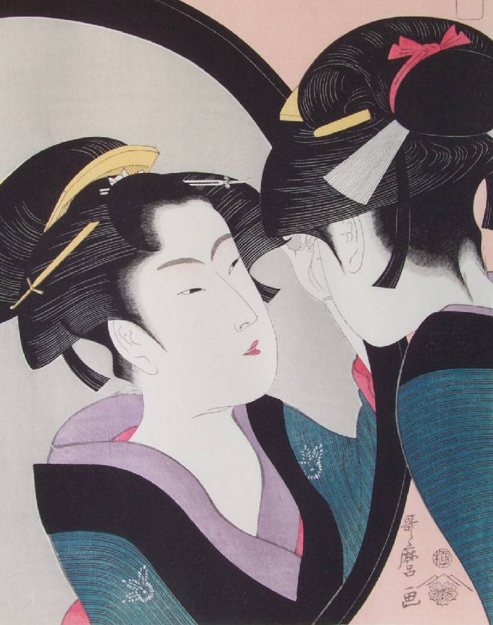 Very Good. Skillful "bokashi" shading; sumptuous "mica" background to mirror's surface; highly detailed hairlines. |