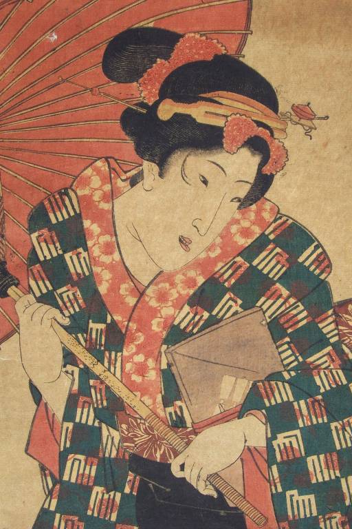 Lovely. An elegant Edo bijin in tall geta, clutches an open umbrella with perhaps an "e-hon" tucked under her arm. |