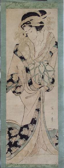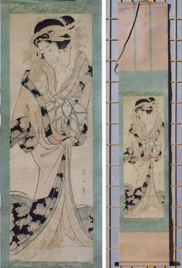 Striking. An exquisite portrait of an upper-class Edo bijin with a a folded letter clutched in her hand. Nicely mounted as a hanging scroll. Rarely seen "kakemono" by the master of "bijin-ga." |