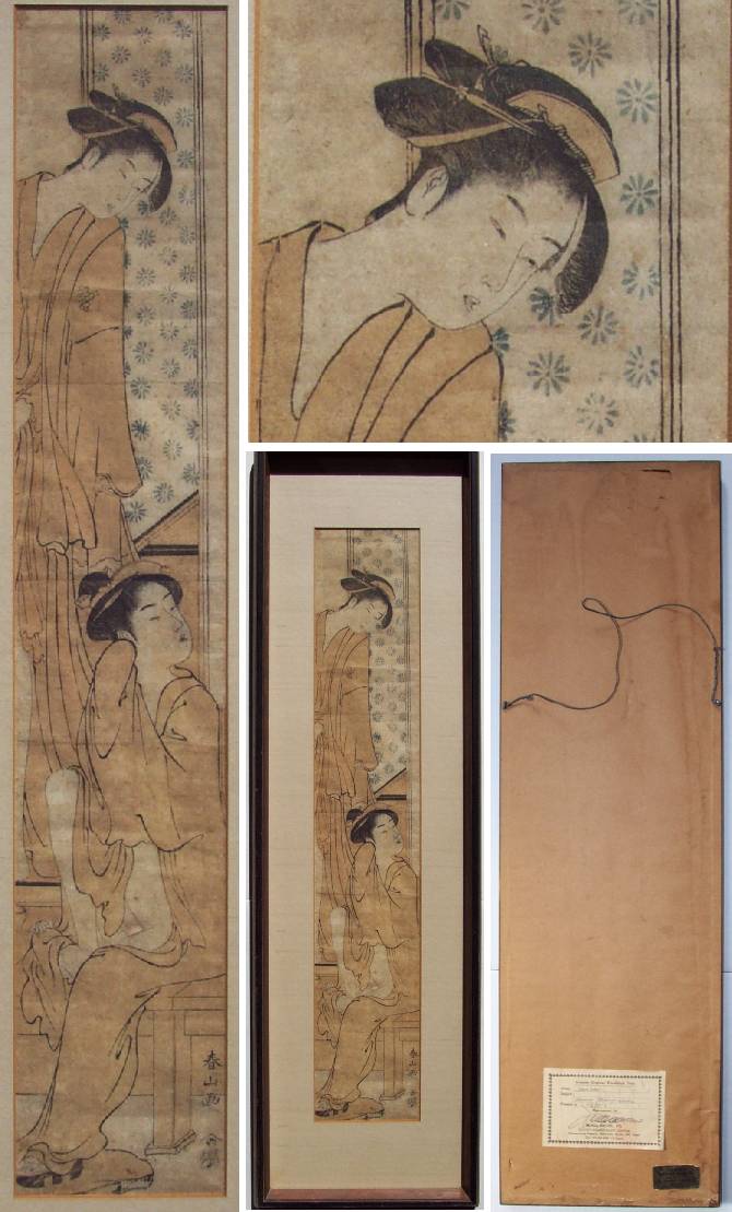 4 1/4 x 23 7/8 overall, "hashira-e" (pillar-print) format (2 sheets joined, ea 4 1/4 x 12). Frame is 9 1/4 x 30 7/8. |