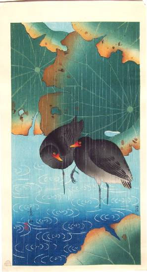 "Black Moorhens Under Lotus in Rain" (given name) |