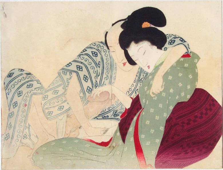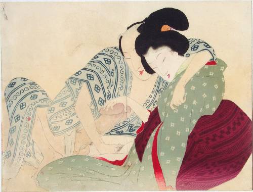 A geisha seen fondling the unusually large member of a young samurai who responds in kind. A large, deluxe, technical masterpiece (see article on: "Deluxe Printing Techniques"). |