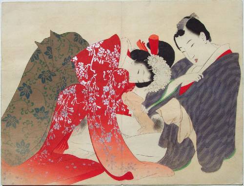 A geisha seen stroking the unusually large member of a young samurai. A large, deluxe, technical masterpiece (see article on: "Deluxe Printing Techniques"). |