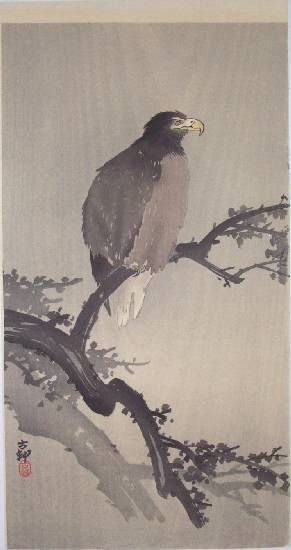 A white-tailed eagle (Haliaeetus albicilla) sits boldly atop a branch. PRE-1923 earthquake (note: Daikoku-ya Publisher