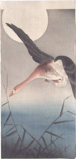 A striking Koson image of a white-fronted goose in flight before a full moon. PRE-1923 earthquake (note: