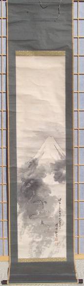 Striking. A dramatic "sumi-e" painting of a dragon amidst the clouds beneath Mt. Fuji--nicely mounted as a hanging scroll. A unique, true one-of-a-kind artwork. |