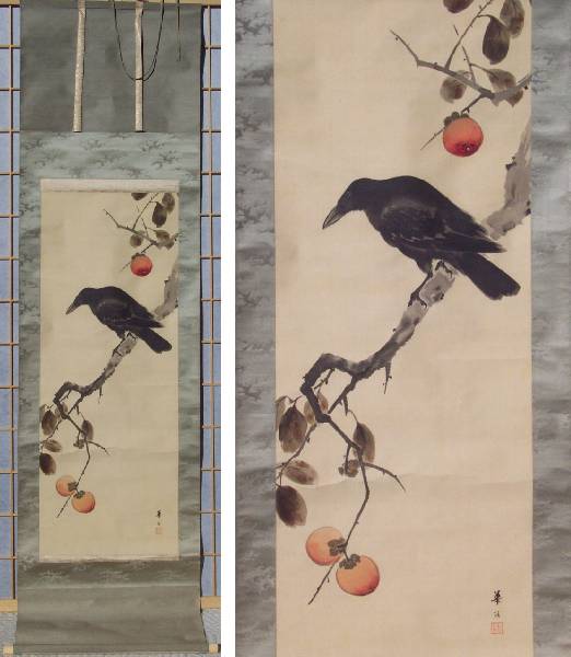 A very nicely done painting of a large "jungle crow" perched on the branch of a persimmon tree--nicely mounted as a hanging scroll. A unique, true one-of-a-kind artwork. |